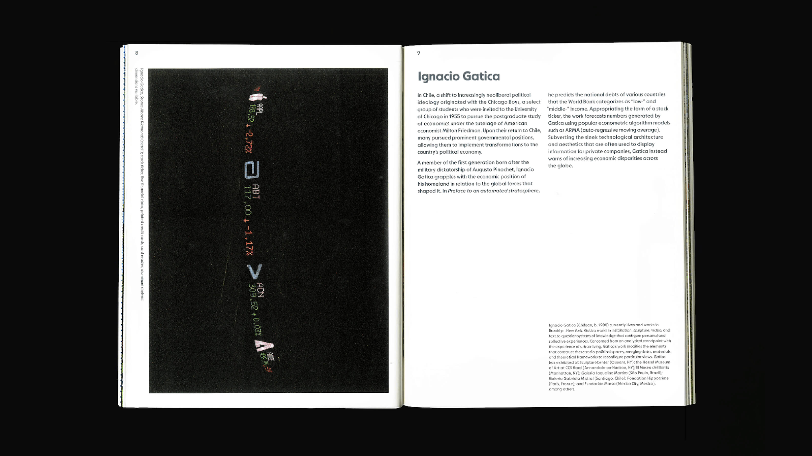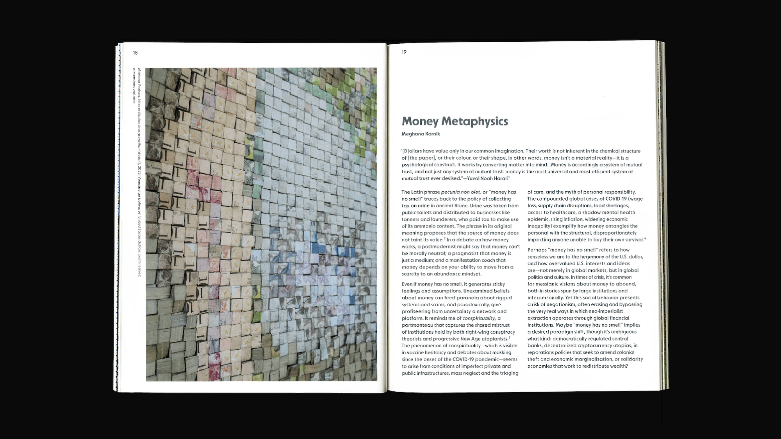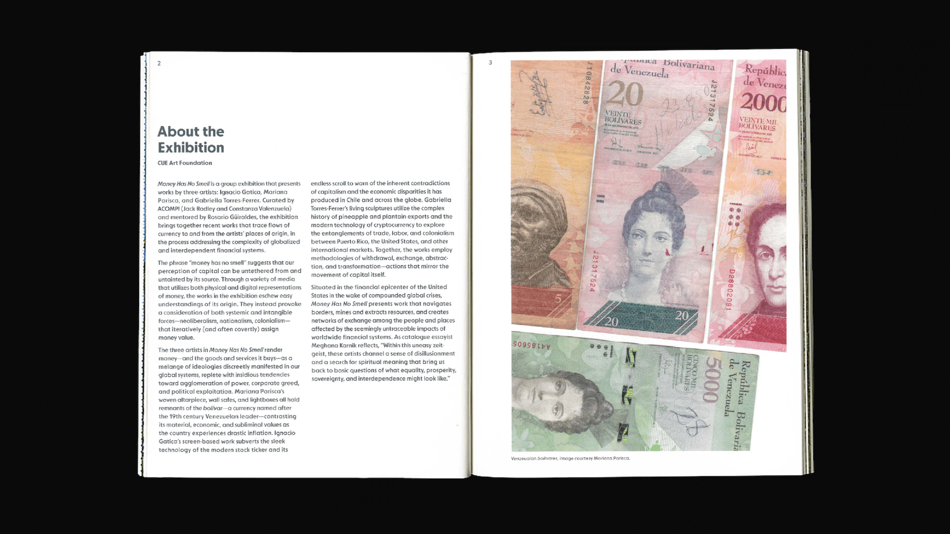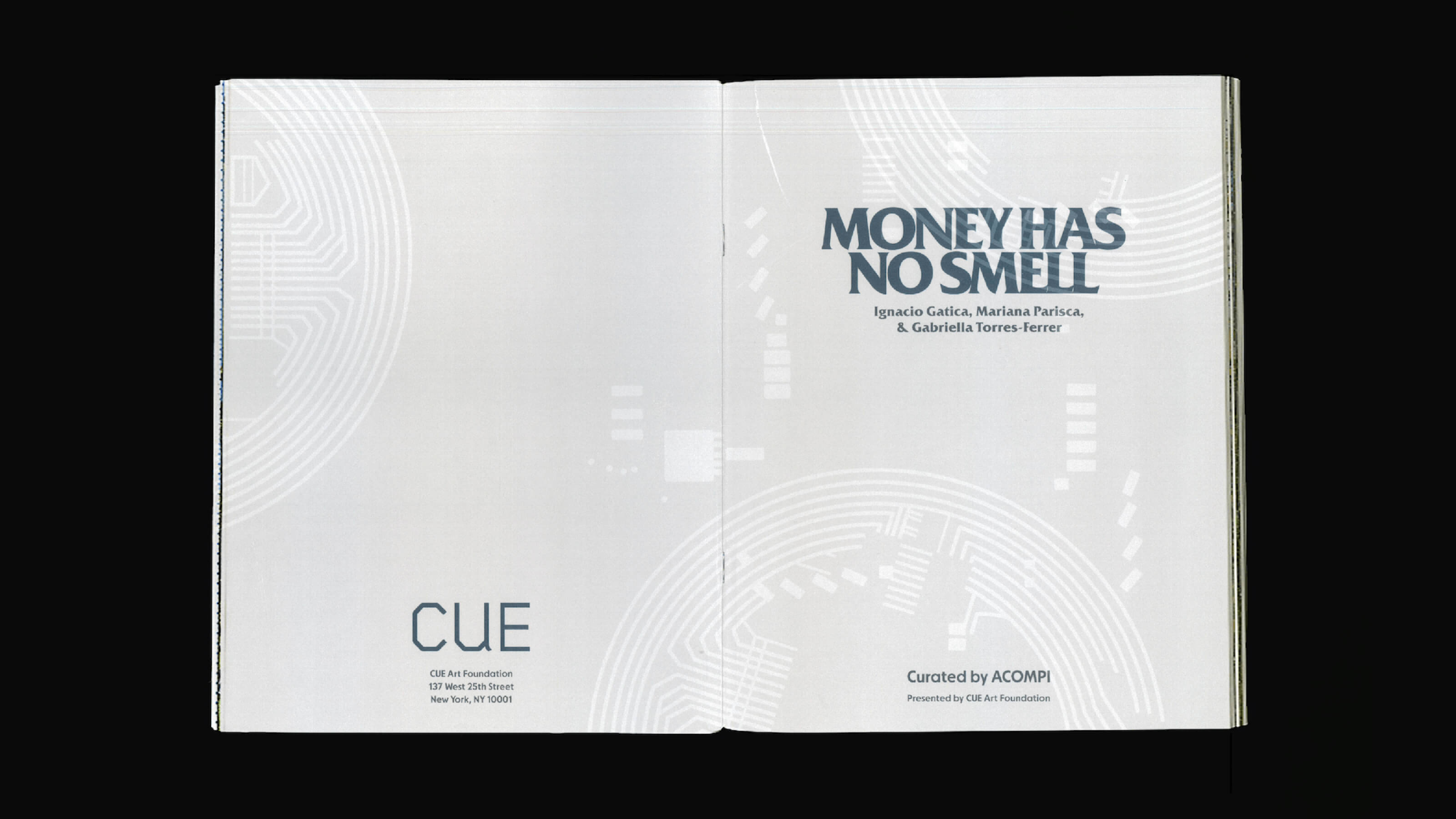 The exhibition's identity co-opts the language of capital, acknowledging its staying power, ubiquity, and bizarre camp. Pinned beneath a labyrinth of vector art — pulled from cryptocurrency renders and flattened into a simulated watermark — lies the exhibition's logo, set in a typeface recognizable by its presence on NYPD's headquarters; Chilean government communications; and other emblems of capitalist authority. The accompanying catalogue, set in both orientations, asks the viewer to consider its content from multiple angles; and has since been shown at NADA Miami.