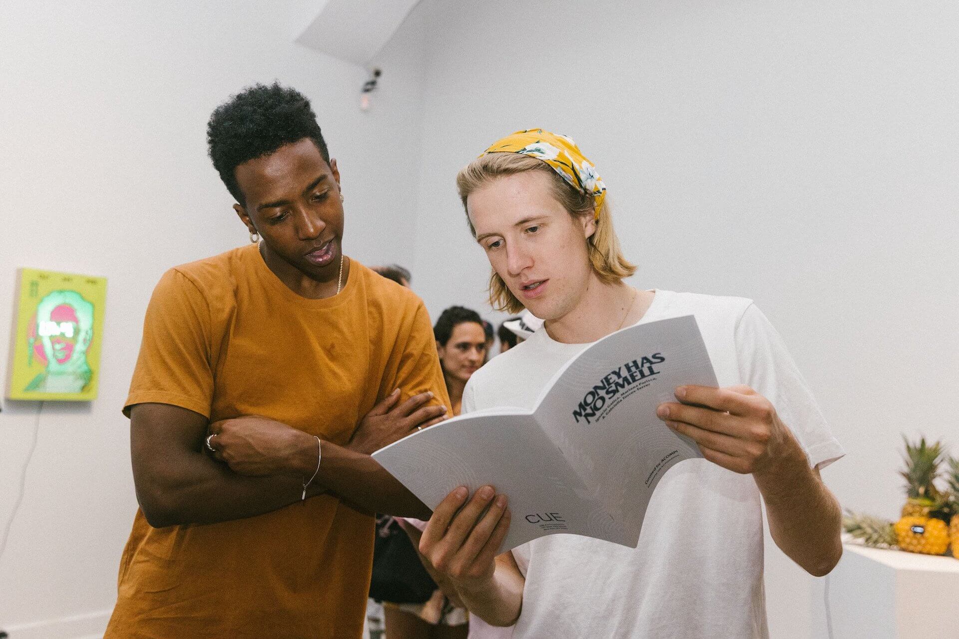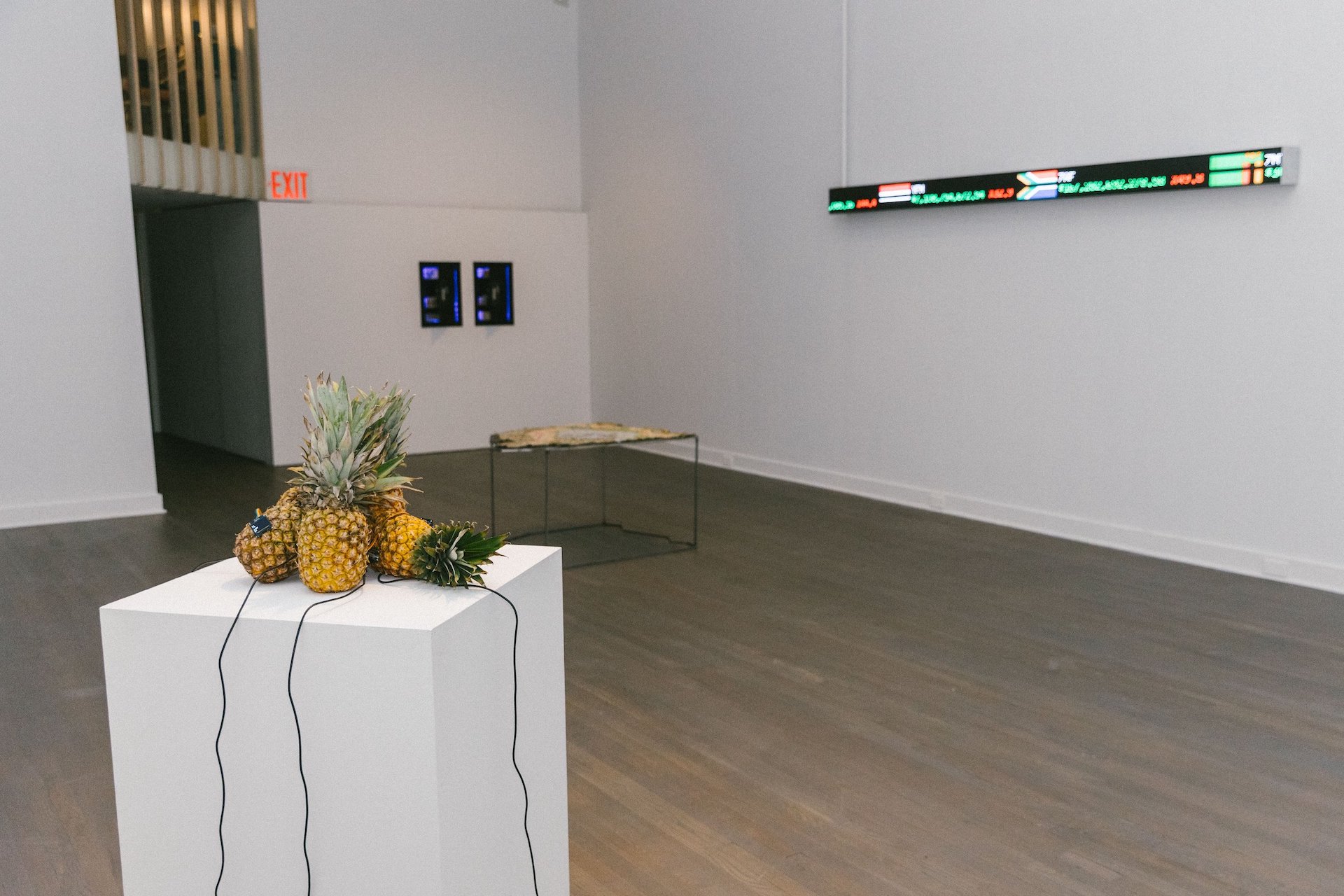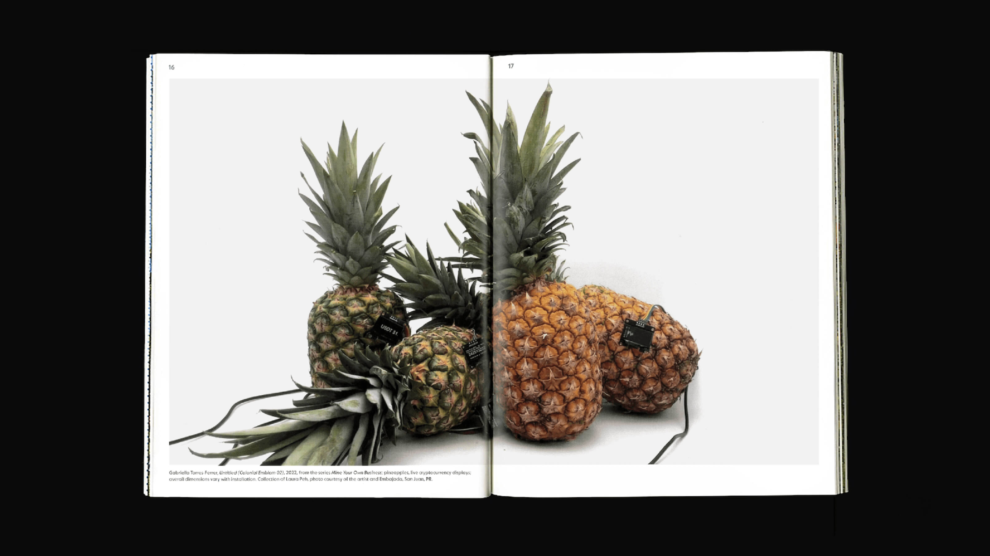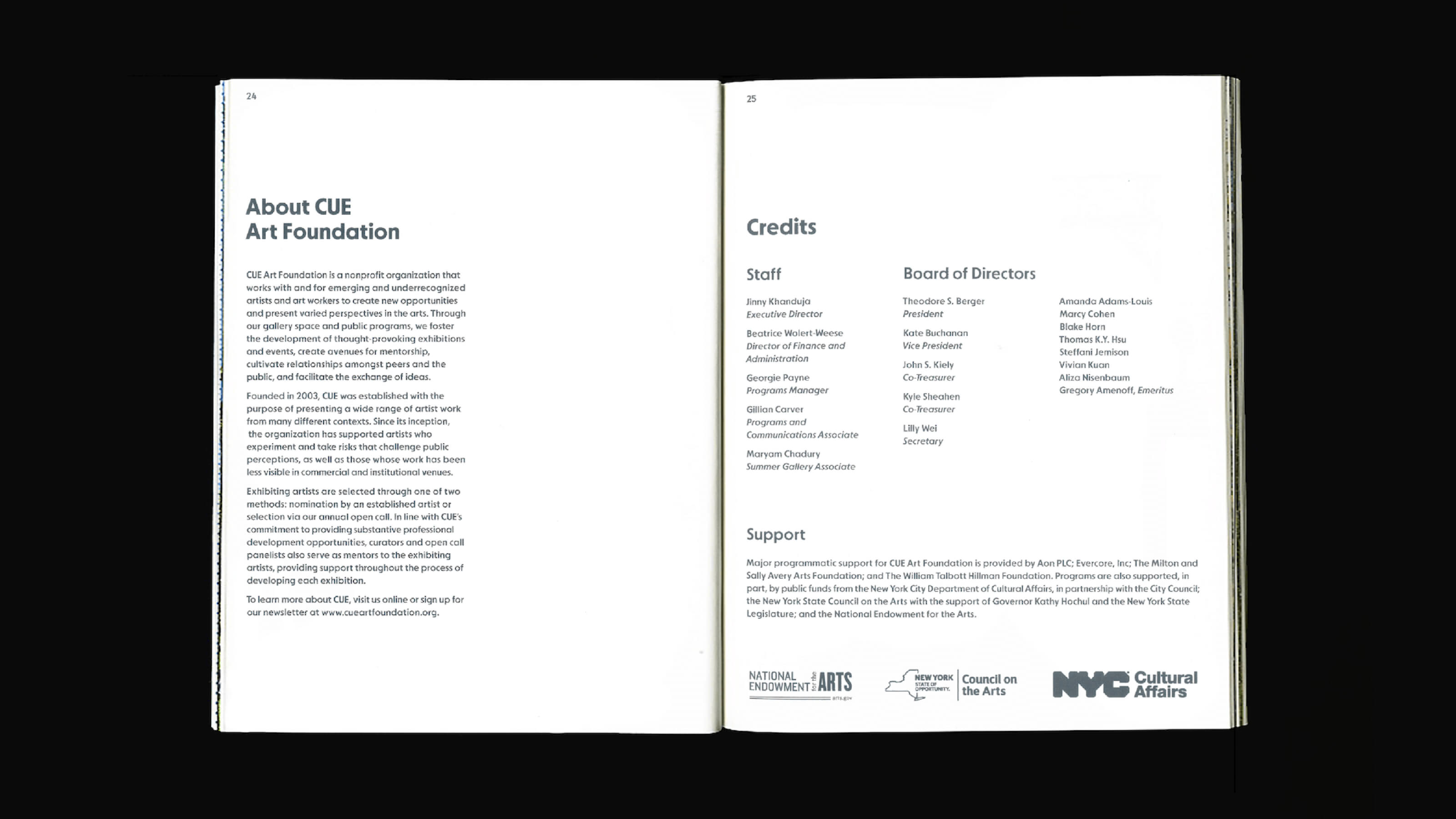 The exhibition's identity co-opts the language of capital, acknowledging its staying power, ubiquity, and bizarre camp. Pinned beneath a labyrinth of vector art — pulled from cryptocurrency renders and flattened into a simulated watermark — lies the exhibition's logo, set in a typeface recognizable by its presence on NYPD's headquarters; Chilean government communications; and other emblems of capitalist authority. The accompanying catalogue, set in both orientations, asks the viewer to consider its content from multiple angles; and has since been shown at NADA Miami.
