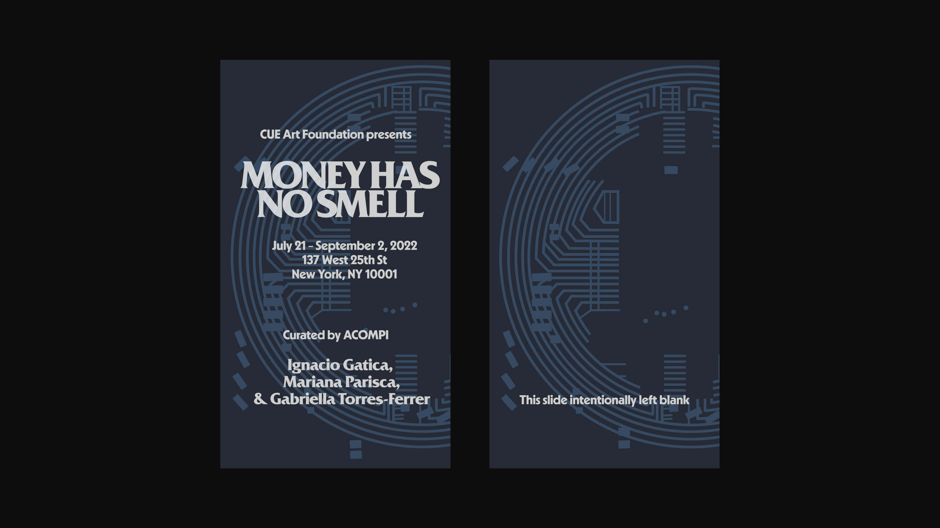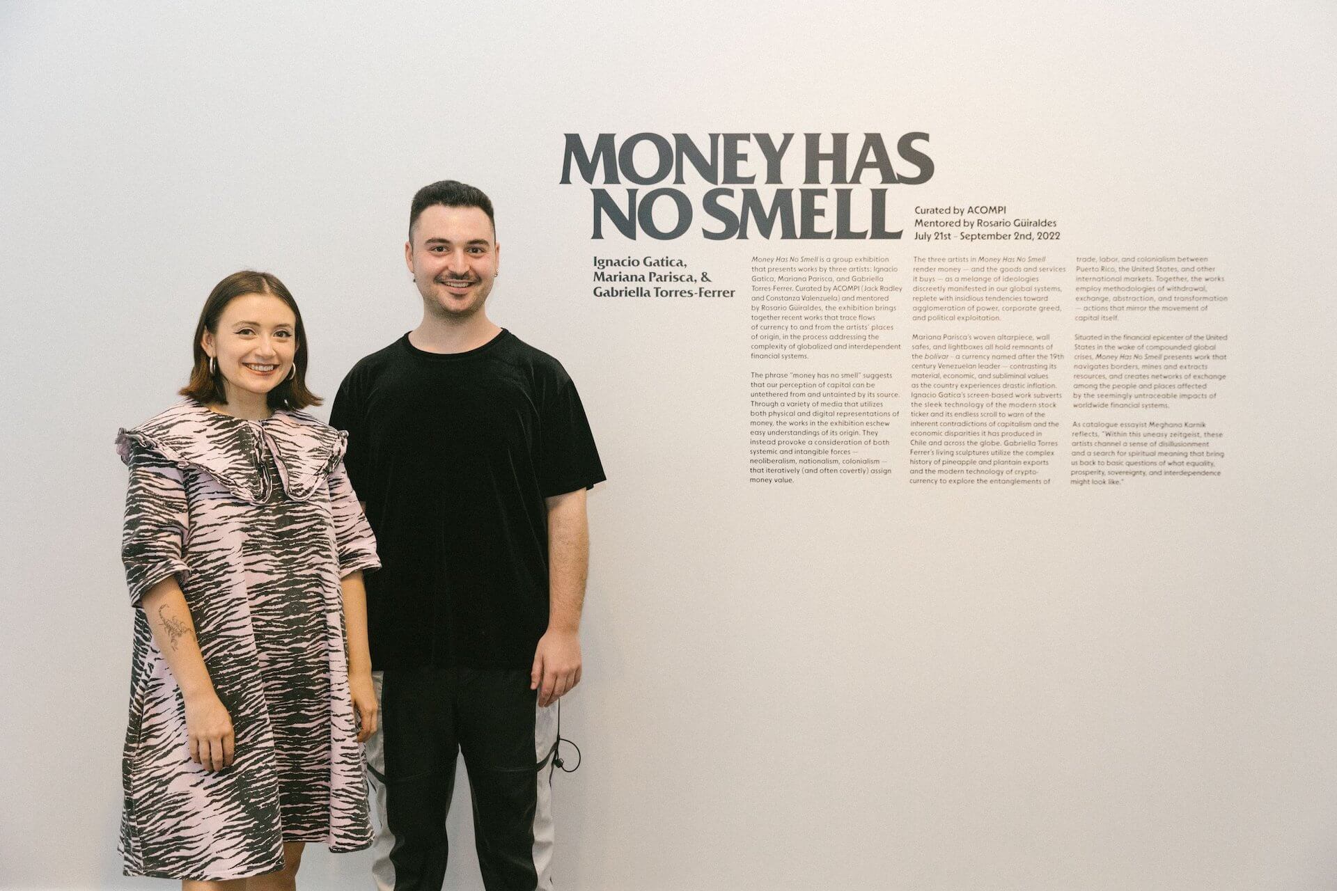 Money Has No Smell presented works by three artists: Ignacio Gatica, Mariana Parisca, and Gabriella Torres-Ferrer. Curated by ACOMPI (Jack Radley and Constanza Valenzuela) and mentored by Rosario Güiraldes, the exhibition brings together recent works that trace flows of currency to and from the artists’ places of origin, in the process addressing the complexity of globalized and interdependent financial systems.